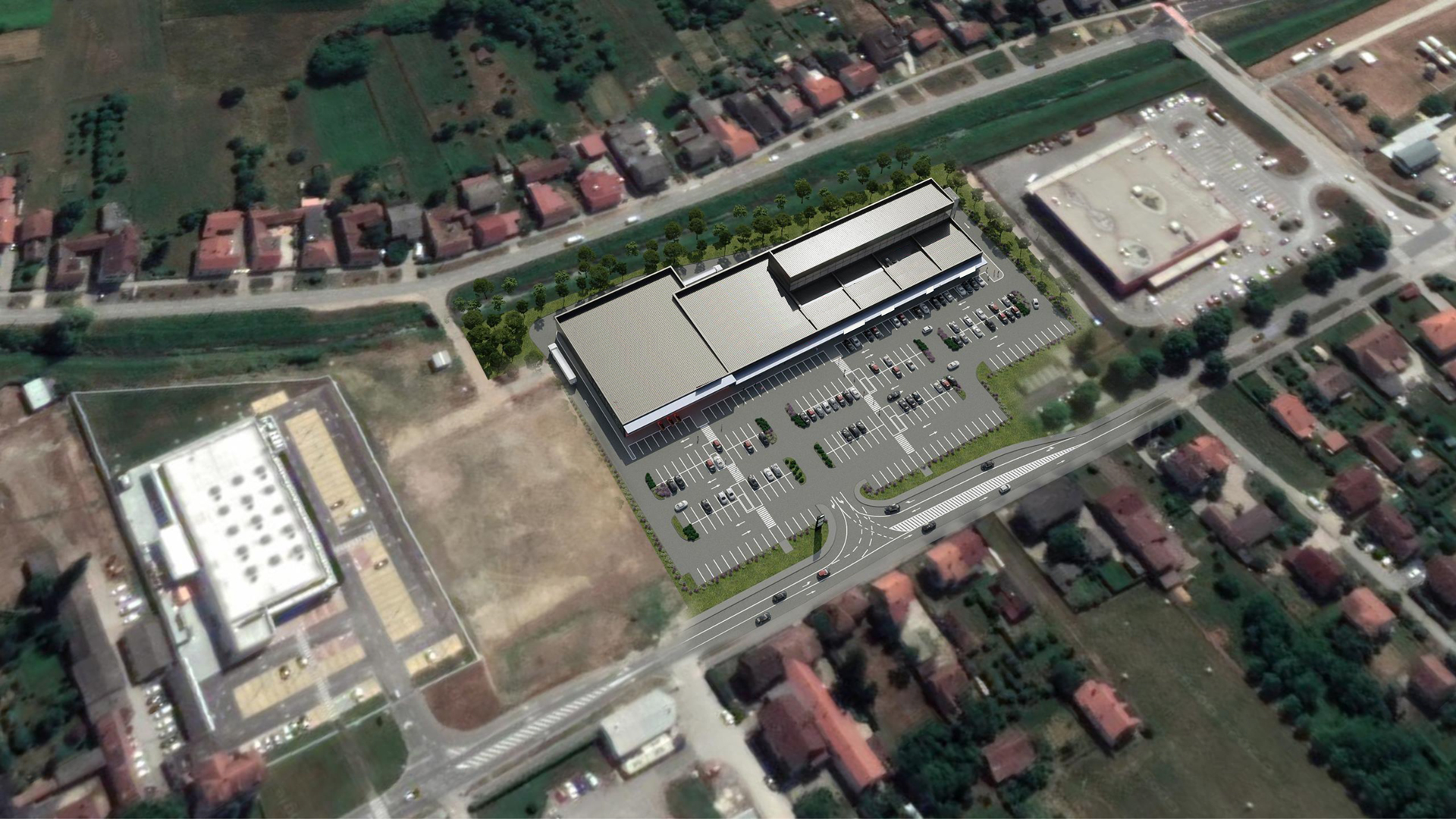 The land plot size is 18.587,00 m2, micro-located in between the two main roads entering the city Križevci, next to the project are supermarkets Plodine and Eurospin.